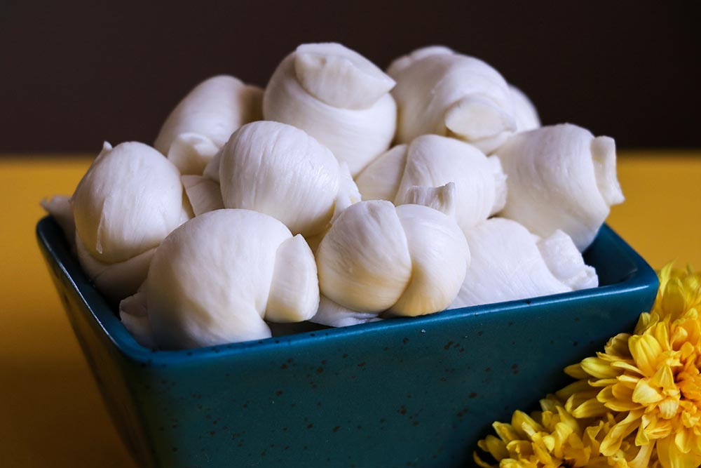 Bocconcini Cheese is egg-sized fresh Mozzarella cheese. They are semi-soft, white and rindless, unripened mild cheeses made from water buffalo’s milk. These bite-sized cheeses have a refreshingly delicate and creamy aroma. Because of its elastic texture and consistency, Italians like to savour them in a salad, wrap them in prosciutto or serve them with a spinach dish known as Bocconcini Sorentina. A variety of Italian dishes can be spruced up by the very sweet and very light butter taste of Bocconcini. Slice them on pizzas or vegetable dishes and broil in an oven until the cheese just starts to melt. One can confidently pair Bocconcini with white wines such as Sauvignon Blanc and Merlot.
