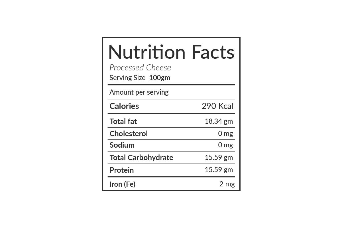 | Ingredients | Annato Colour, Common Salt, Emulsifiers INS331 & INS339, Food Preservative INS200, Gelling Agent INS407, Lactic Cultures, Microbial Rennet, Milk Solids |